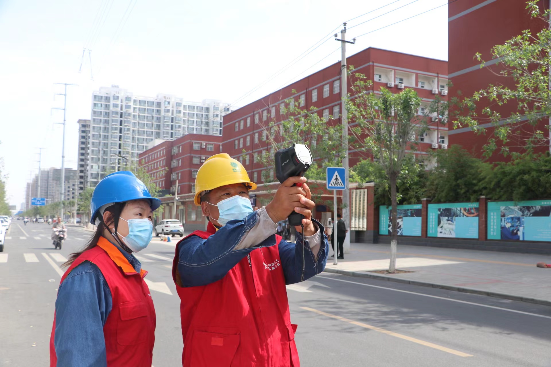 圖為焦裕祿共產(chǎn)黨員服務(wù)隊(duì)工作人員對(duì)考點(diǎn)周圍線路進(jìn)行測(cè)溫