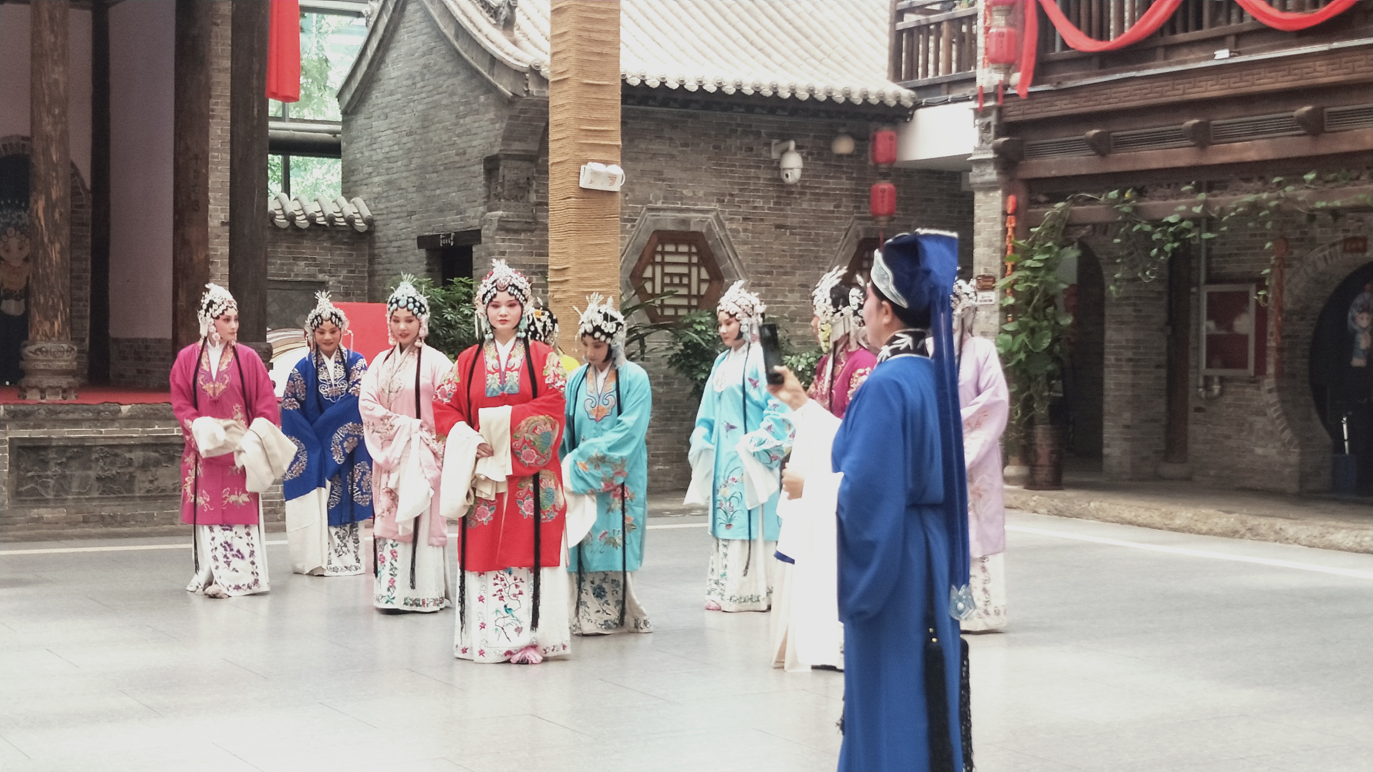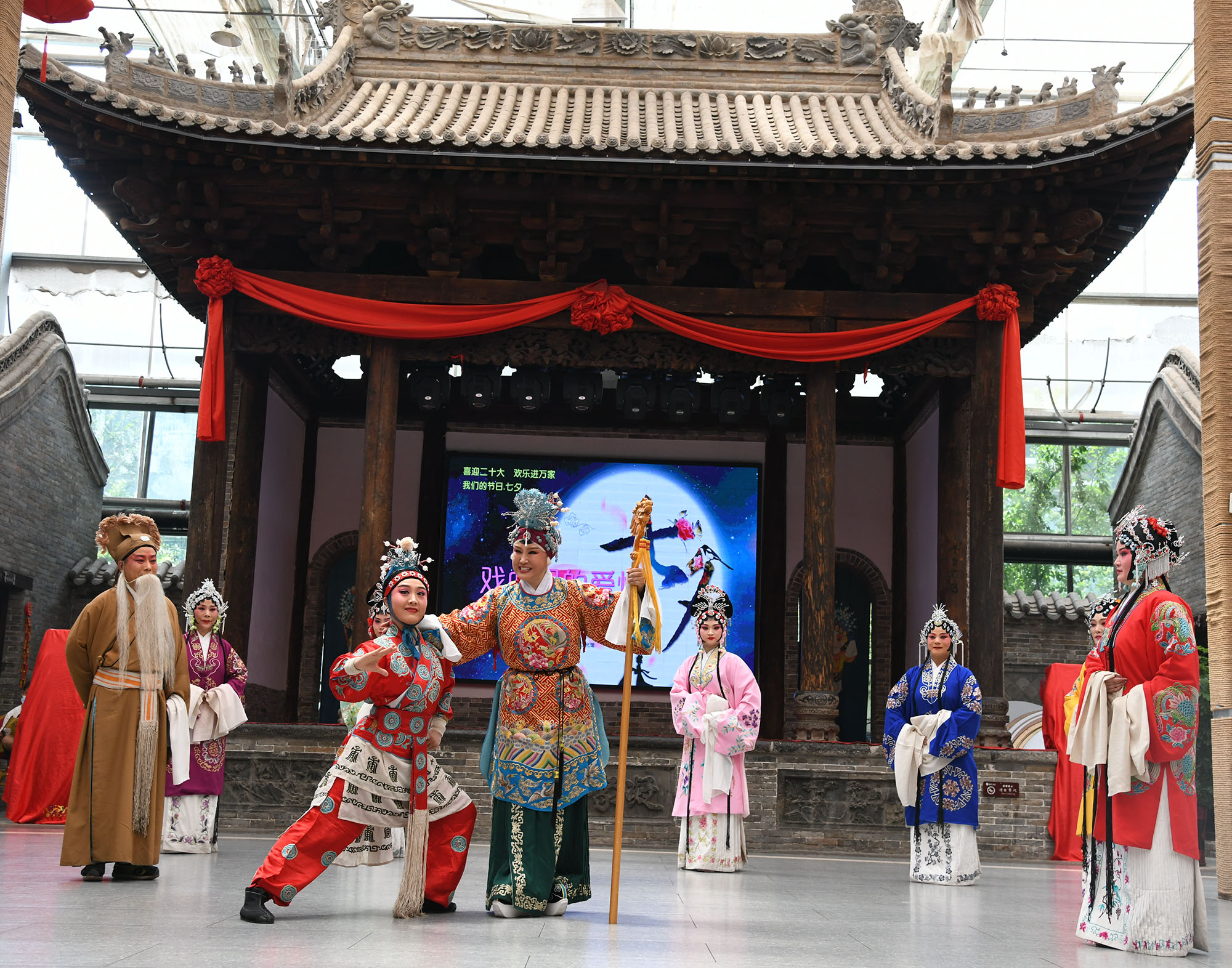 ?8月3日上午,市豫劇團團長、戲劇藝術家肖秀蓮帶領演員們在建業(yè)大食堂演出《五世請纓》中的《一家人歡天喜地》一折。