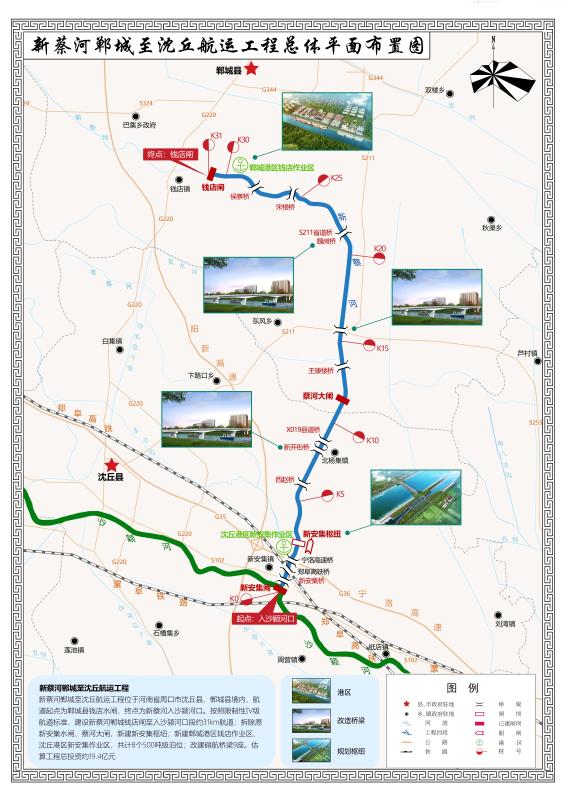 記者了解到,規(guī)劃中的鄲城港區(qū)是以新蔡河為依托,通過分析論證,確定其位置在新蔡河航運(yùn)工程航道起點(diǎn)鄲城縣錢店鎮(zhèn),航道終點(diǎn)為沈丘縣新安集沙潁河口,航道里程31公里。航道通航標(biāo)準(zhǔn)為限制性Ⅳ級,設(shè)計(jì)船舶為500噸級。航道底寬40米,最小設(shè)計(jì)水深3.1米,最小彎曲半徑320米。船閘按照Ⅳ級船閘標(biāo)準(zhǔn)建設(shè)。沿線建設(shè)沈丘港區(qū)新安集、鄲城港區(qū)錢店兩個(gè)作業(yè)區(qū),設(shè)計(jì)500噸級泊位8個(gè),改建礙航橋梁標(biāo)準(zhǔn)9座。初步估算,工程總投資19.4億元。
