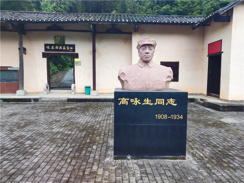 舊址前廣場上,有高詠生烈士石刻雕像。他頭戴紅軍帽,目光如炬,深情地望著遠處的蒼茫青山,流露出欣慰的笑容。記者輕輕撫摸雕像。此時此刻,沉默恰是最好的語言。