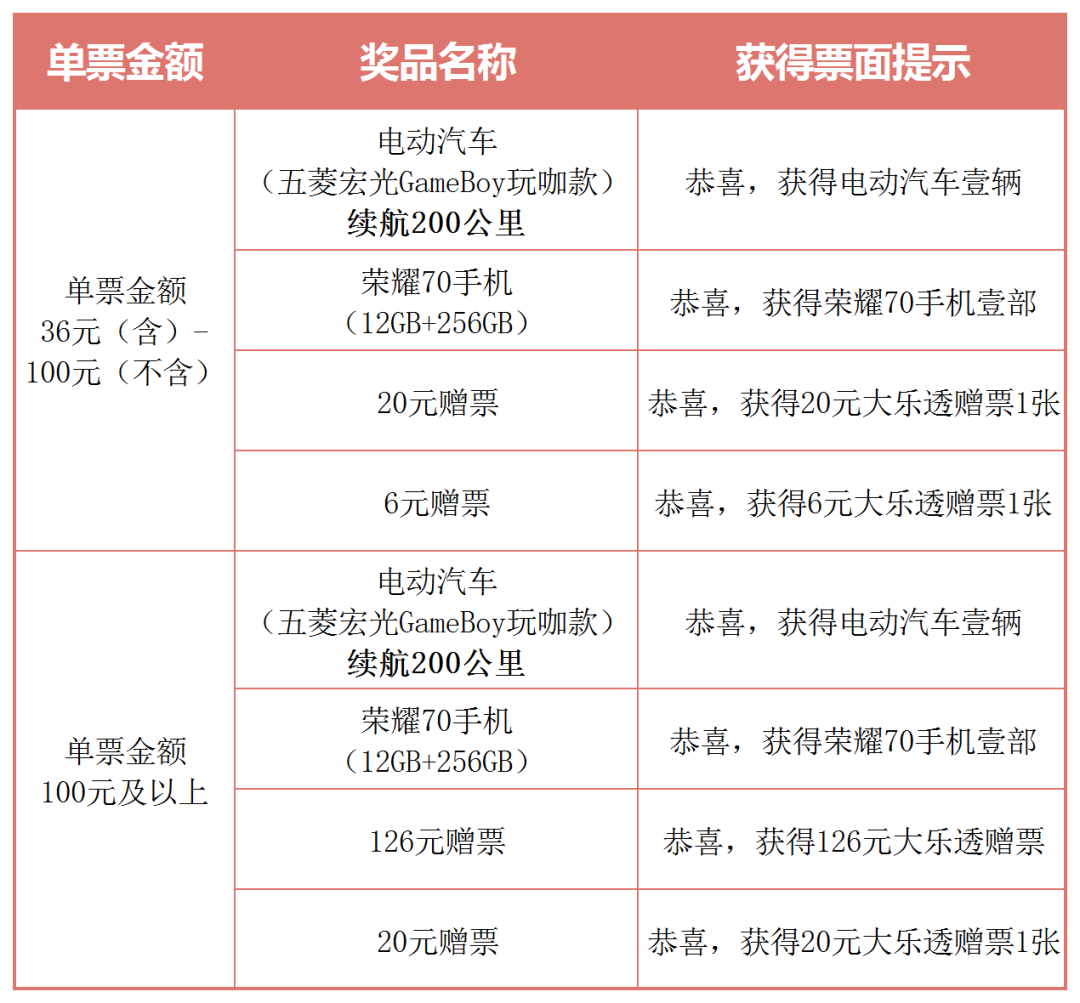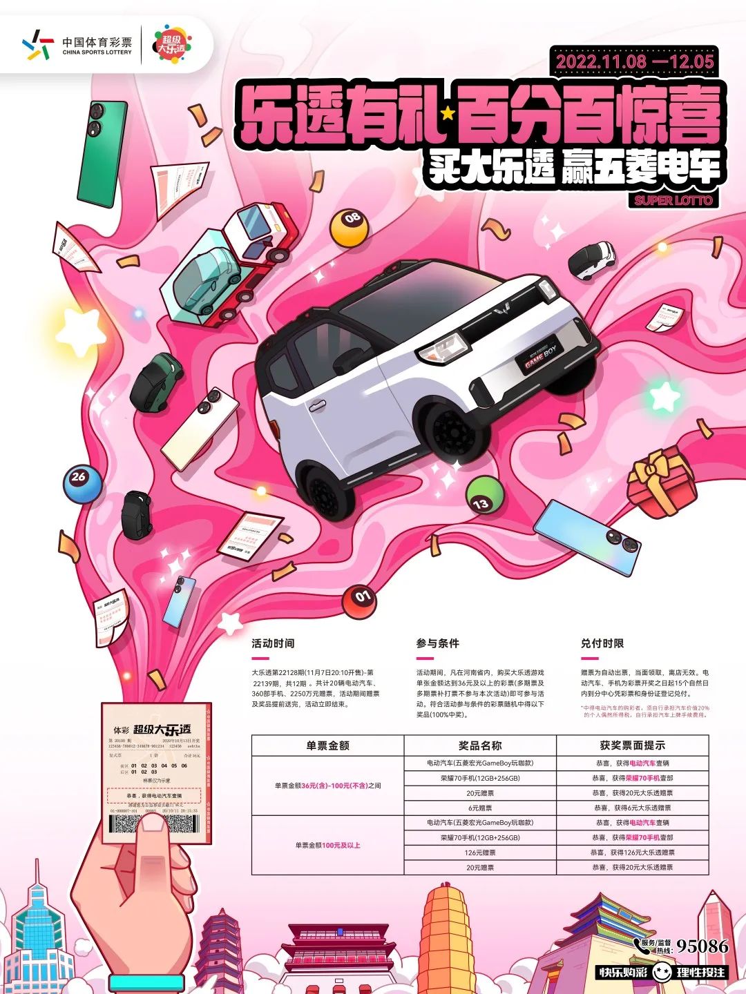 活動期間,凡在河南省內,購買大樂透游戲單張金額達到36元及以上的彩票(多期票及多期票補打票不參與本次活動,以下同)即可參與活動。有機會中得電動汽車、榮耀70手機、126元贈票、20元贈票、6元贈票等。