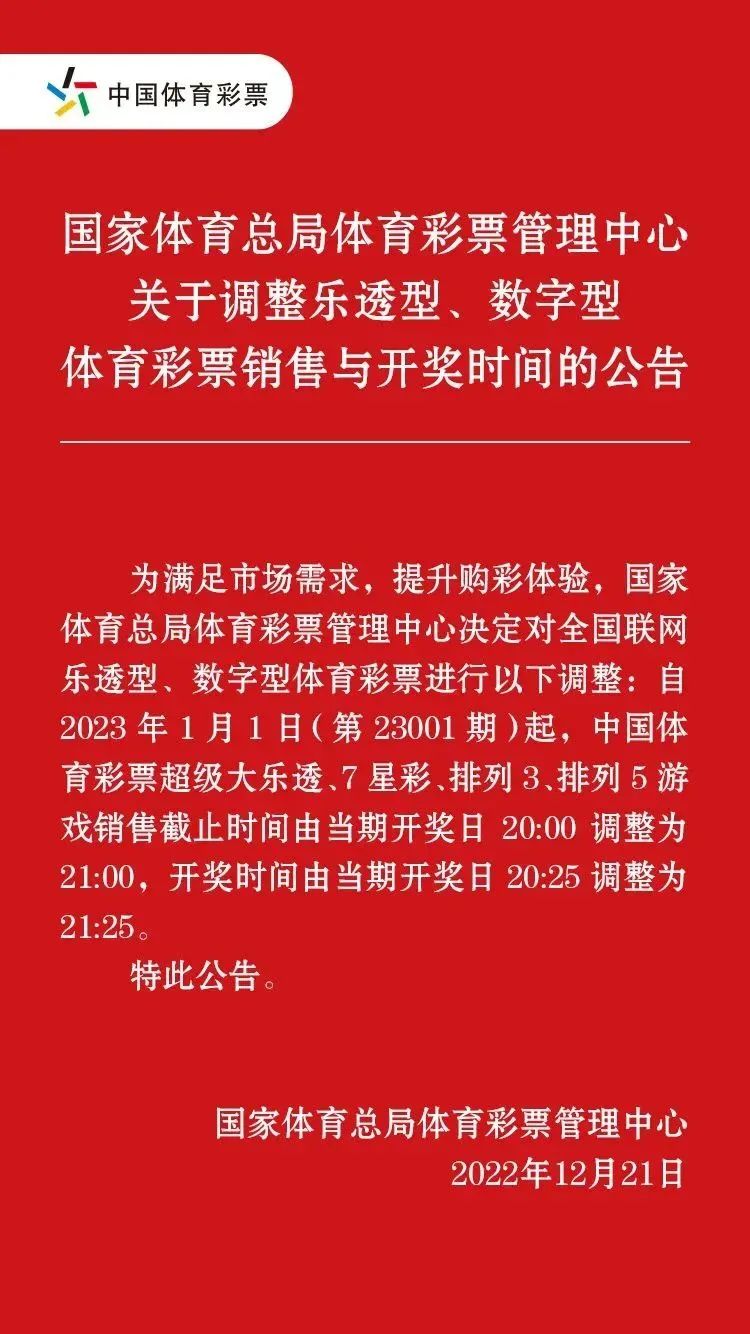 2023年1月1日(第23001期)起,體彩超級(jí)大樂透、7星彩、排列3、排列5游戲的銷售截止時(shí)間將延后至每晚21:00,開獎(jiǎng)時(shí)間將延后至不同游戲相應(yīng)開獎(jiǎng)日當(dāng)晚21:25。體彩上述四款游戲止售、開獎(jiǎng)延后一小時(shí),將為購彩者帶來更加便利的購彩體驗(yàn)。