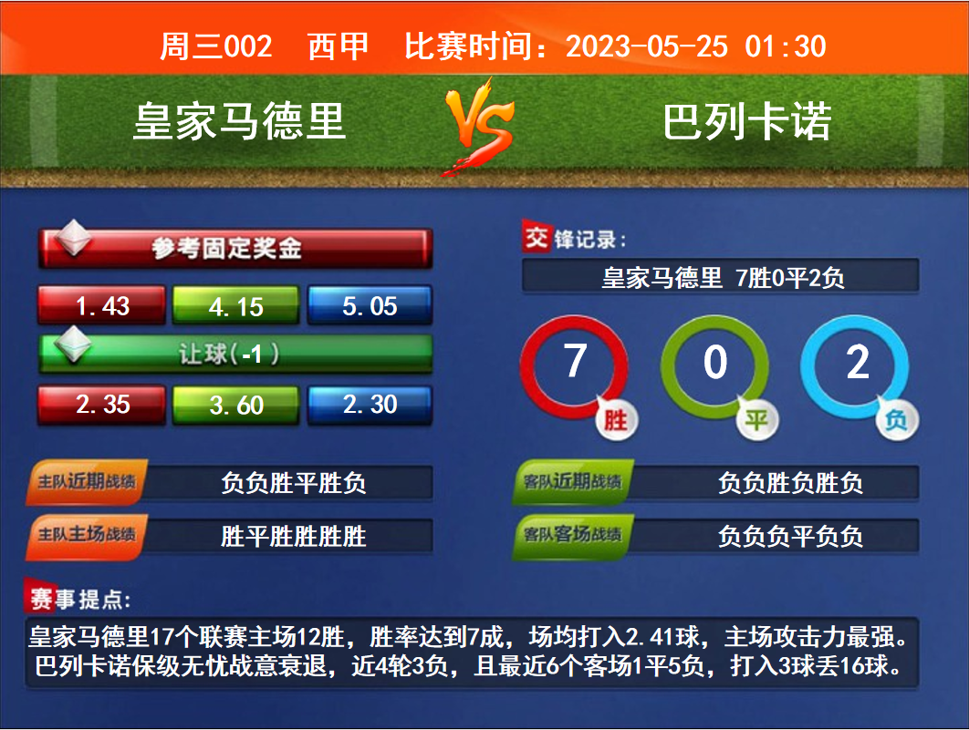比賽時(shí)間:2023-05-25 01:30 賽事提點(diǎn):皇家馬德里17個(gè)聯(lián)賽主場(chǎng)12勝,勝率達(dá)到7成,場(chǎng)均打入2.41球,主場(chǎng)攻擊力最強(qiáng)。巴列卡諾保級(jí)無(wú)憂戰(zhàn)意衰退,近4輪3負(fù),且最近6個(gè)客場(chǎng)1平5負(fù),打入3球丟16球。