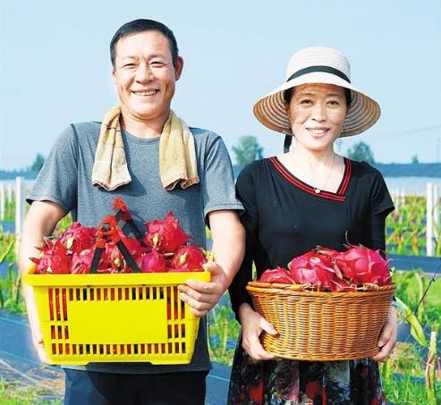 盛夏時節(jié),萬木蔥蘢。在太康縣清集鎮(zhèn)夢里田園火龍果種植基地,一株株仙人掌狀的火龍果成行排列,一個個飽滿的火龍果如火焰般垂掛枝頭。打扮利落的劉秀英邊用手機(jī)拍攝火龍果果皮上黃綠相間的鱗狀花萼,邊向粉絲介紹火龍果的長勢和收成情況。