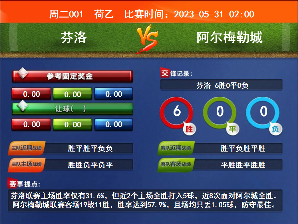 比賽時間:2023-05-31 02:00賽事提點:芬洛聯(lián)賽主場勝率僅有31.6%,但近2個主場全勝打入5球,近8次面對阿爾城全勝。阿爾梅勒城聯(lián)賽客場19戰(zhàn)11勝,勝率達(dá)到57.9%,且場均只丟1.05球,防守最佳。