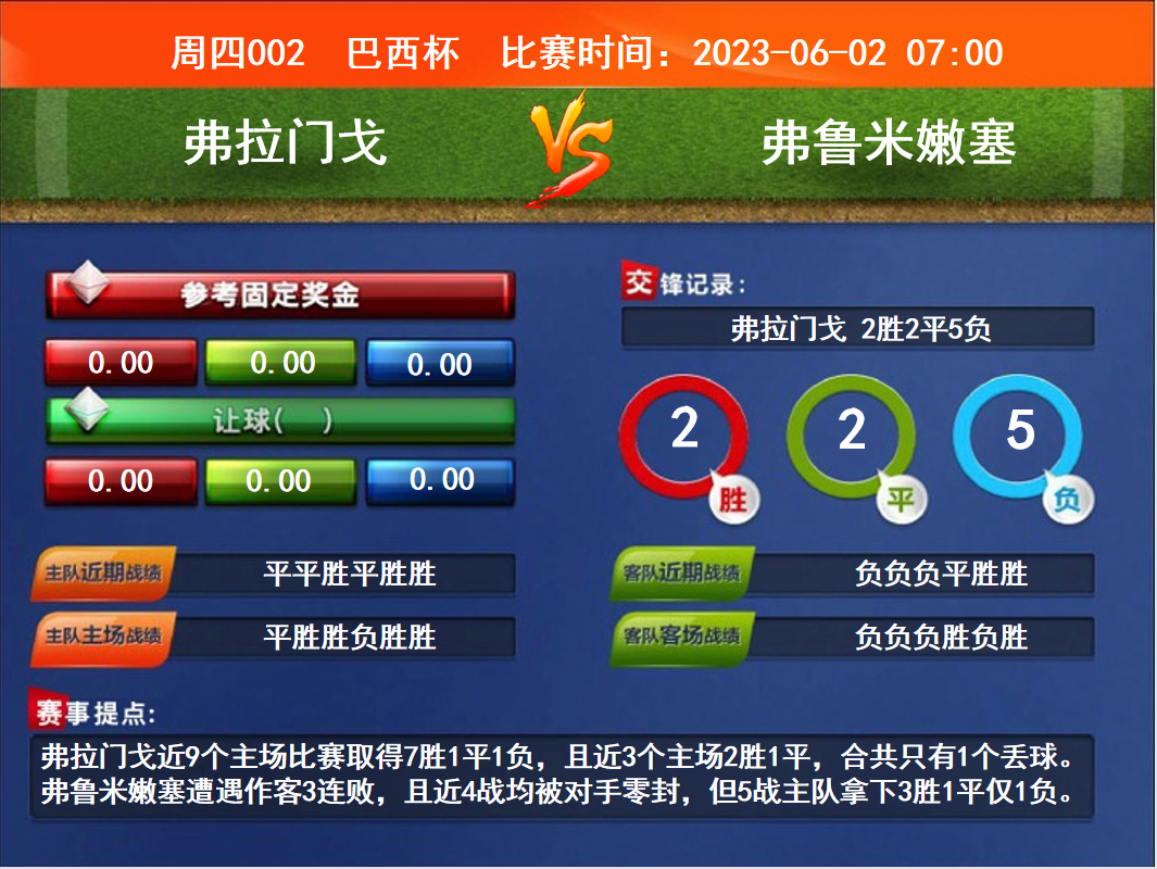 比賽時(shí)間:2023-06-02 07:00賽事提點(diǎn):弗拉門戈近9個(gè)主場(chǎng)比賽取得7勝1平1負(fù),且近3個(gè)主場(chǎng)2勝1平,合共只有1個(gè)丟球。弗魯米嫩塞遭遇作客3連敗,且近4戰(zhàn)均被對(duì)手零封,但5戰(zhàn)主隊(duì)拿下3勝1平僅1負(fù)。