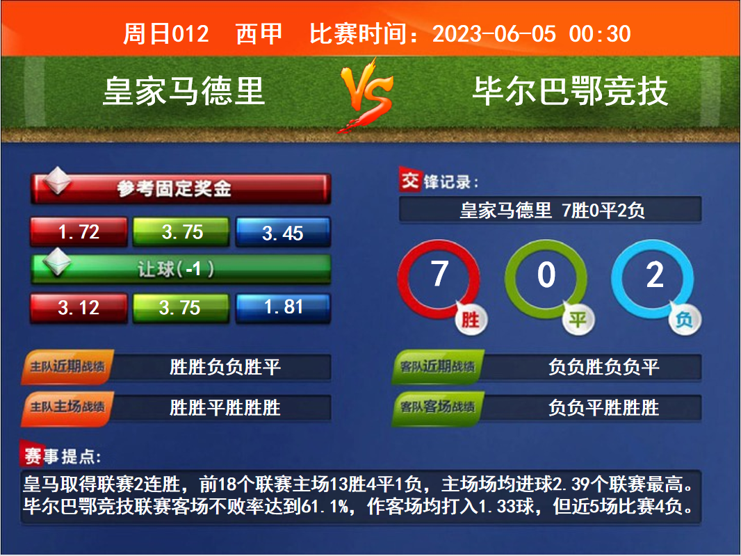 比賽時(shí)間:2023-06-05 00:30賽事提點(diǎn):皇馬取得聯(lián)賽2連勝,前18個(gè)聯(lián)賽主場(chǎng)13勝4平1負(fù),主場(chǎng)場(chǎng)均進(jìn)球2.39個(gè)聯(lián)賽最高。畢爾巴鄂競(jìng)技聯(lián)賽客場(chǎng)不敗率達(dá)到61.1%,作客場(chǎng)均打入1.33球,但近5場(chǎng)比賽4負(fù)。