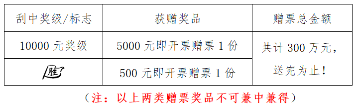 活動期間,購彩者在河南省范圍內(nèi)任一體彩銷售實體店購買指定活動票種,若單張彩票刮中符合獎勵條件的獎級或標志,經(jīng)實體店終端兌獎設備成功完成獎金兌付及促銷兌獎掃描后,即可獲得即開票贈票獎品一份??傤~有限,送完為止,詳見下表: