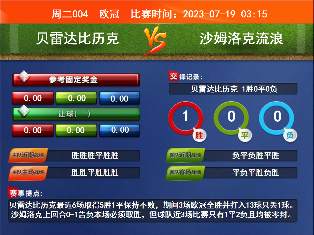 比賽時間:2023-07-19 03:15賽事提點:貝雷達比歷克最近6場取得5勝1平保持不敗,期間3場歐冠全勝并打入13球只丟1球。沙姆洛克上回合0-1告負本場必須取勝,但球隊近3場比賽只有1平2負且均被零封。