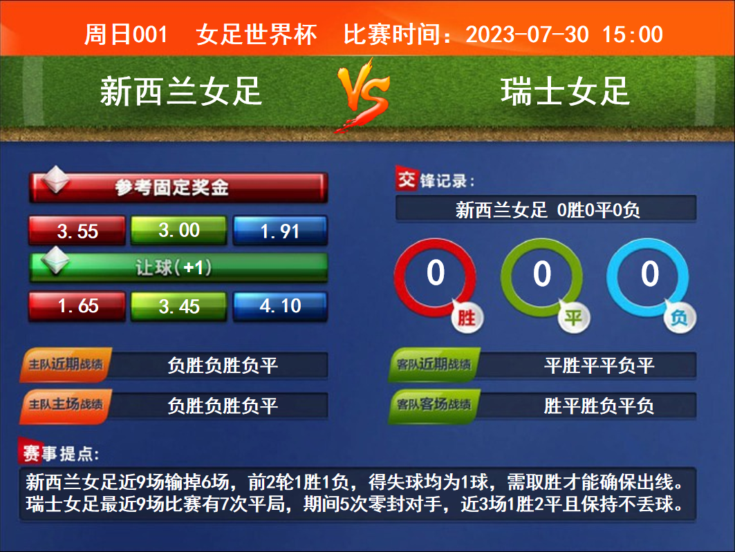 比賽時間:2023-07-30 15:00賽事提點:新西蘭女足近9場輸?shù)?場,前2輪1勝1負,得失球均為1球,需取勝才能確保出線。瑞士女足最近9場比賽有7次平局,期間5次零封對手,近3場1勝2平且保持不丟球。