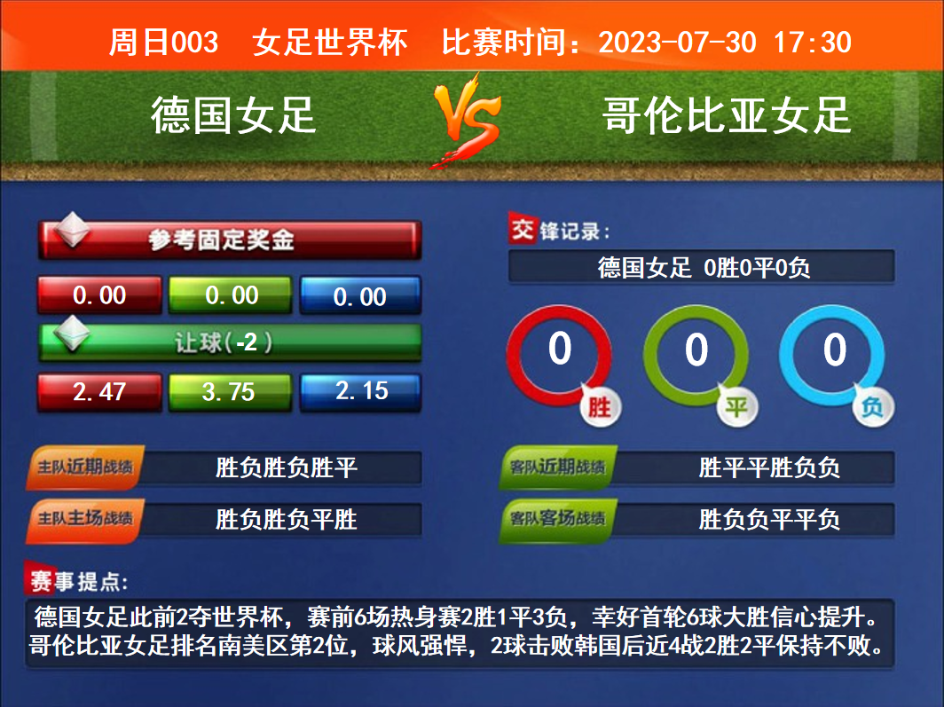 比賽時間:2023-07-30 17:30賽事提點:德國女足此前2奪世界杯,賽前6場熱身賽2勝1平3負,幸好首輪6球大勝信心提升。哥倫比亞女足排名南美區(qū)第2位,球風(fēng)強悍,2球擊敗韓國后近4戰(zhàn)2勝2平保持不敗。