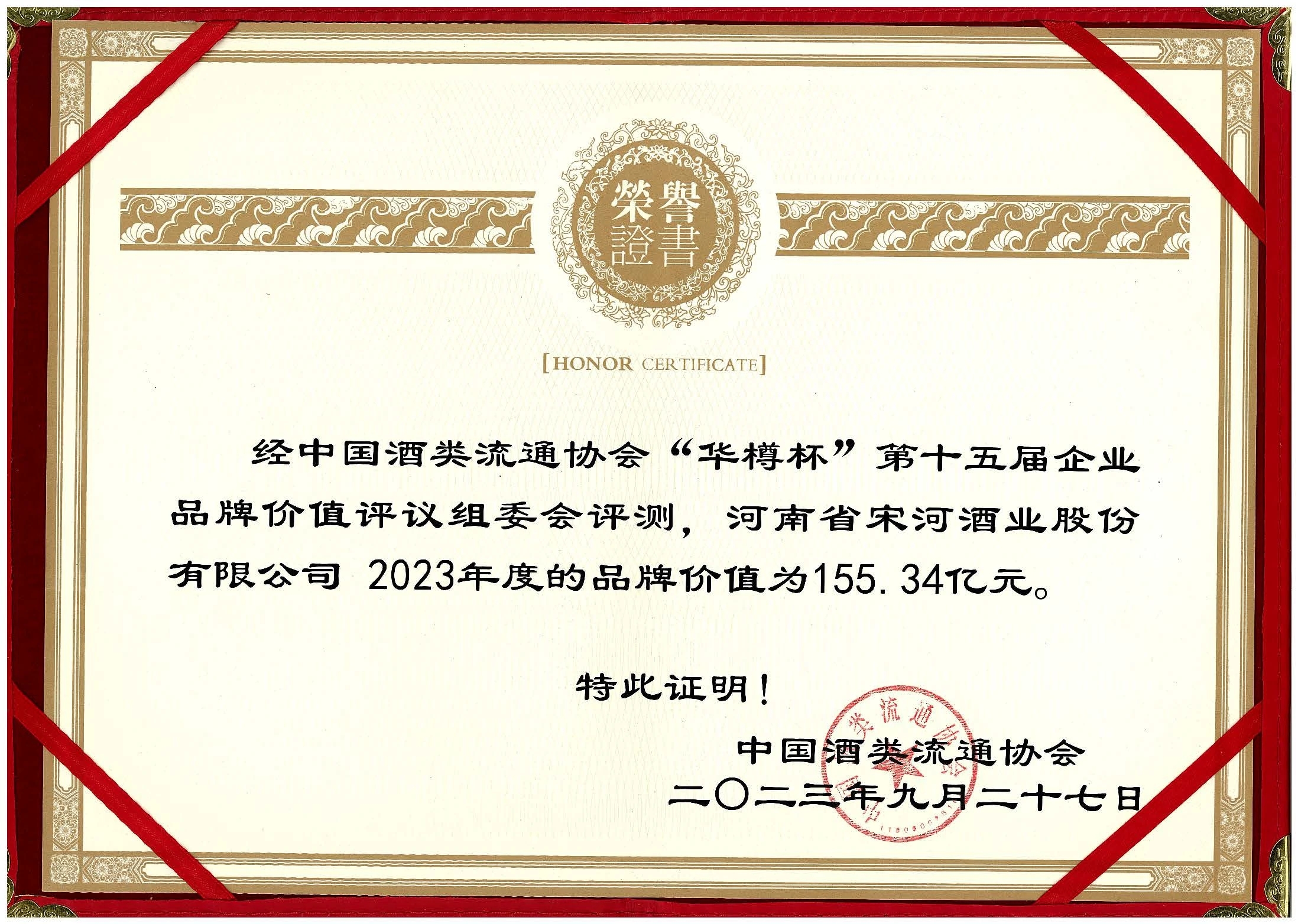 9月27日,第十五屆中國酒類企業(yè)品牌價(jià)值發(fā)布會(huì)在北京國家會(huì)議中心隆重舉辦。經(jīng)企業(yè)品牌價(jià)值評(píng)議委員會(huì)評(píng)測,宋河酒業(yè)2023年度的品牌價(jià)值為155.34億元。作為河南唯一的濃香型中國名酒品牌,宋河酒業(yè)同時(shí)在會(huì)上斬獲多項(xiàng)殊榮。