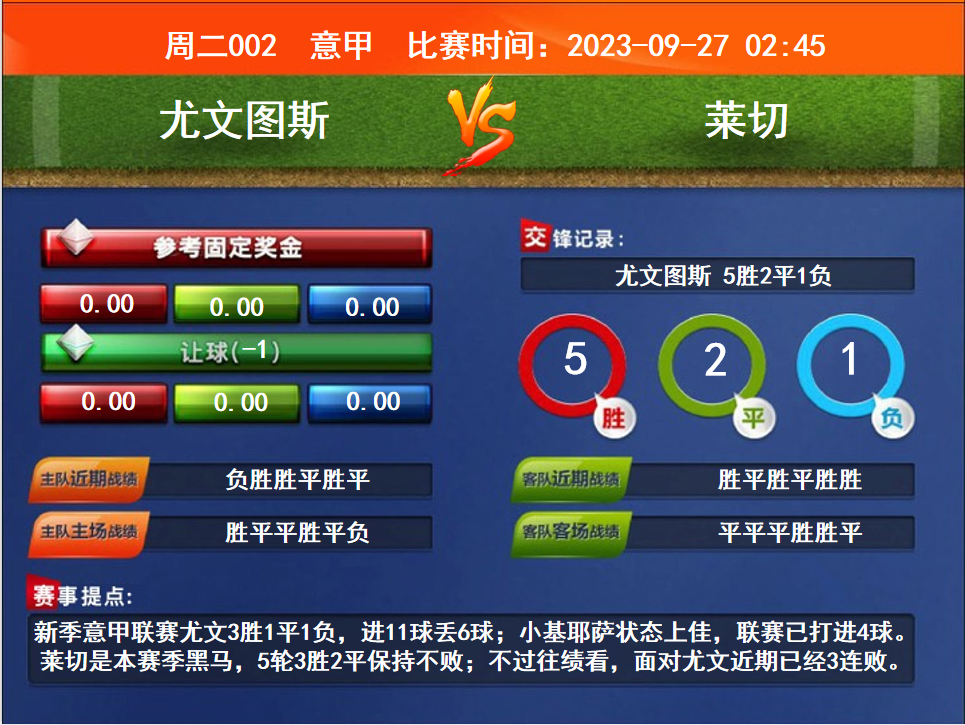 比賽時間:2023-09-27 02:45賽事提點(diǎn):新季意甲聯(lián)賽尤文3勝1平1負(fù),進(jìn)11球丟6球;小基耶薩狀態(tài)上佳,聯(lián)賽已打進(jìn)4球。萊切是本賽季黑馬,5輪3勝2平保持不?。徊贿^往績看,面對尤文近期已經(jīng)3連敗。