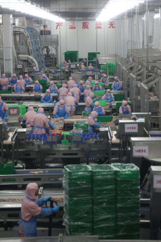 宰殺廠房的燈光比掛雞處的更暗了,除了星星點點的監(jiān)控?zé)艄猓瑤缀蹩床坏桨子鸹铍u的運動軌跡。僅僅一步之遙,進入打毛間和掏膛間,白羽雞進行退毛,去頭和去爪后,等待清潔預(yù)冷和被精準(zhǔn)分割為雞腿、雞翅、雞胸肉等產(chǎn)品。