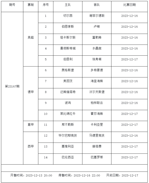 足球彩票勝負(fù)游戲(14場和任選9場)第23167期賽程: