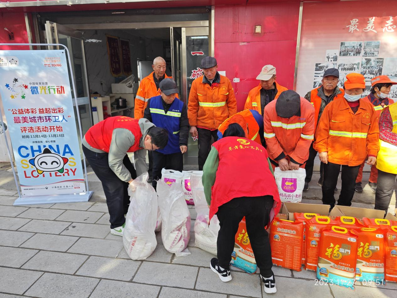 11月27日,周口體彩分中心工作人員攜帶米、面等物資來到“東方愛心粥屋”開展“公益體彩 益起出彩”致敬“城市最美環(huán)衛(wèi)人”活動(dòng)公益活動(dòng),對(duì)20名“城市最美環(huán)衛(wèi)人”開展捐助。