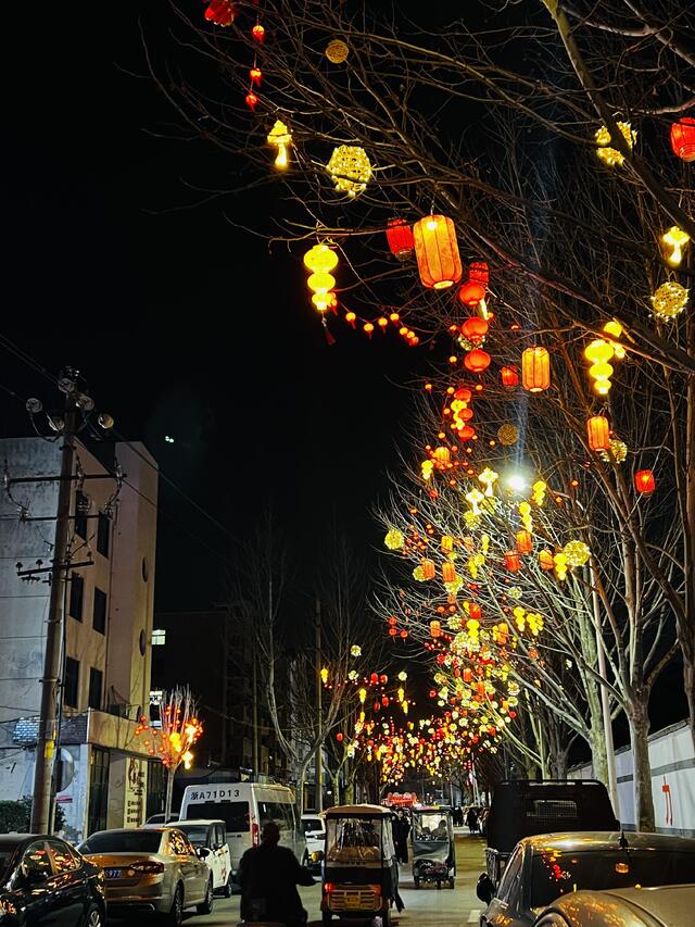 2月18日晚,記者在川匯區(qū)荷花路看到,路旁樹上掛滿了各式各樣的春節(jié)燈飾。紅色的燈籠沿街道綿延鋪展,金色的燈球在晚風(fēng)中輕輕搖曳,光影將這條老街的輪廓勾勒得靈動雅致。