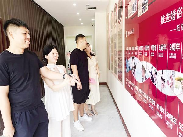 近年來(lái),沈丘縣加大精神文明建設(shè)力度,通過(guò)舉辦文化大講堂等活動(dòng),在廣大群眾中形成“天價(jià)彩禮不可取,鋪張浪費(fèi)最可恥,陳規(guī)陋習(xí)危害大”的共識(shí),許多年輕人在耳濡目染中受到熏陶,新事新辦蔚然成風(fēng)。圖為8月29日,農(nóng)歷七月初七,結(jié)婚登記的新人在婚史展板前駐足。