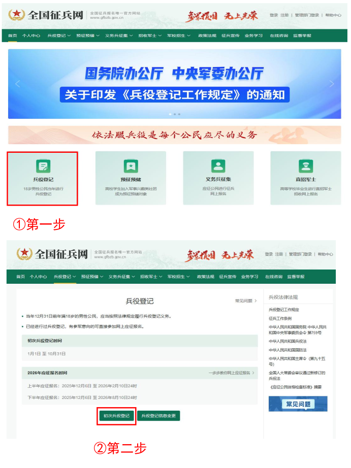 《中華人民共和國兵役法》規(guī)定,“國家實(shí)行兵役登記制度。兵役登記包括初次兵役登記和預(yù)備役登記。每年十二月三十一日以前年滿十八周歲的男性公民,都應(yīng)當(dāng)按照兵役機(jī)關(guān)的安排在當(dāng)年進(jìn)行初次兵役登記”。參加兵役登記是法律賦予每個(gè)適齡男性公民應(yīng)盡的光榮義務(wù)和神圣責(zé)任,應(yīng)自覺按時(shí)進(jìn)行登記或核對(duì)。