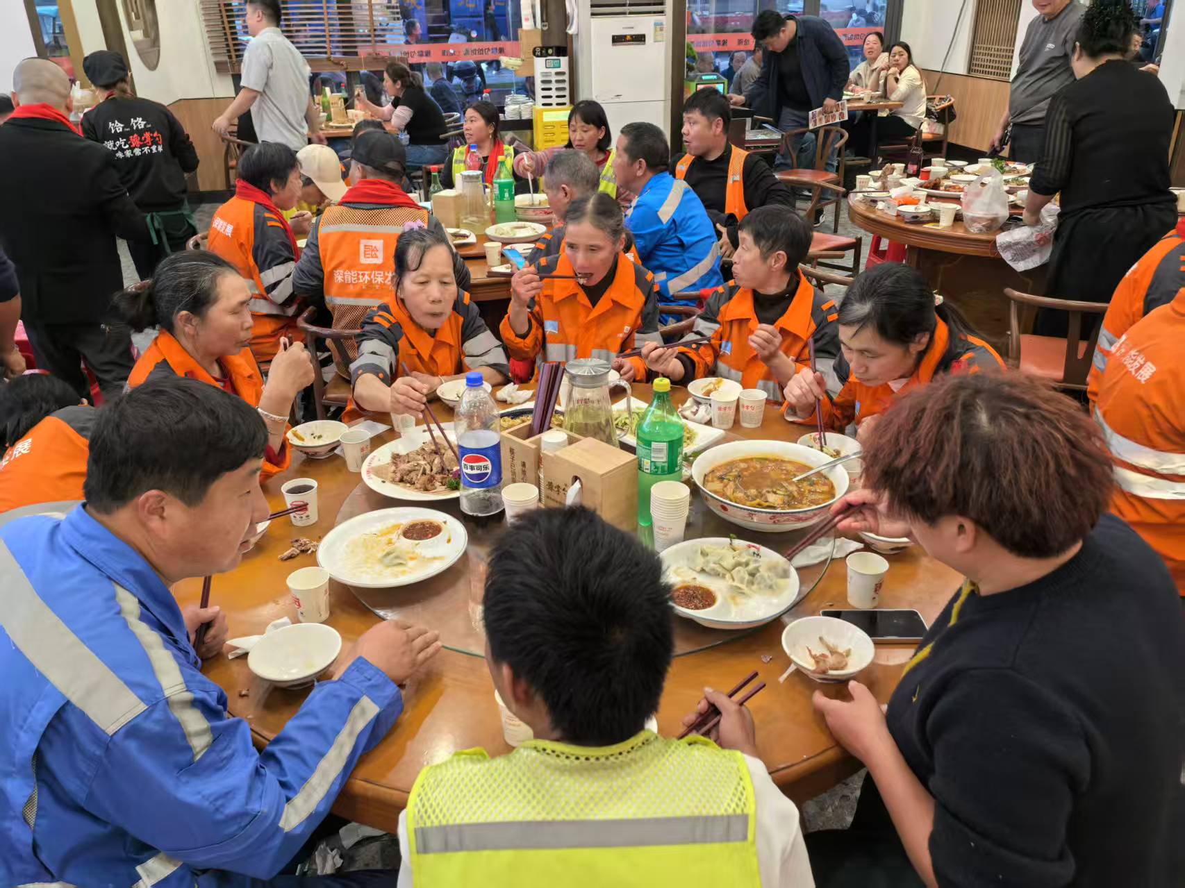 活動當(dāng)天,剛剛結(jié)束清掃工作的“城市美容師”們身穿工服陸續(xù)抵達。張高鵬早已在門口迎接,熱情問候每一位工人并送上新春祝福。席間,道口燒雞、五香牛蹄筋、酸菜魚等十多道佳肴相繼上桌,暖意融融的用餐氛圍中,歡聲笑語不斷,如家人般親切溫馨。