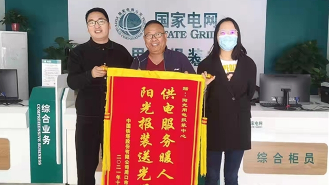 近日,在國網(wǎng)周口供電公司陽光報裝中心,中國鐵塔股份有限公司周口分公司業(yè)務經(jīng)理朱義嶺一邊將印有“供電服務暖人心 陽光報裝送光明”的錦旗遞給供電工作人員,一邊感謝該公司對鐵塔基站建設提供的支持。