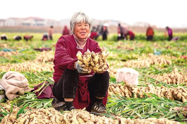 11月16日,淮陽區(qū)曹河鄉(xiāng)朱莊行政村的農(nóng)戶們忙著采收、分揀、搬運飽滿肥碩的生姜。該村四百余畝生姜迎來豐收,預(yù)計畝產(chǎn)超萬斤,將為當(dāng)?shù)剞r(nóng)戶帶來可觀收益。