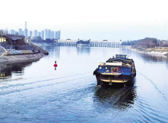 一艘貨船緩緩駛過(guò)南寨歷史文化街區(qū)大渡口,水波蕩漾間,將千年古渡與現(xiàn)代航運(yùn)相連。