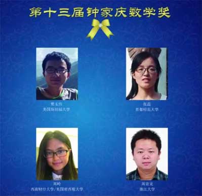 中國(guó)數(shù)學(xué)會(huì)21日揭曉了第十三屆華羅庚數(shù)學(xué)獎(jiǎng)、第十六屆陳省身數(shù)學(xué)獎(jiǎng)和第十三屆鐘家慶數(shù)學(xué)獎(jiǎng)的獲獎(jiǎng)名單。今年獲得鐘家慶數(shù)學(xué)獎(jiǎng)的分別是美國(guó)斯坦福大學(xué)的樊玉偉(來(lái)自河南周口)、首都師范大學(xué)的張蕊、西南財(cái)經(jīng)大學(xué)和美國(guó)密西根大學(xué)的周嶺、浙江大學(xué)的周青龍等4名博士生?!?a href="http://www.dasangmen.net/content/2017-10/23/content_581562.htm" target="_blank" >[詳細(xì)]