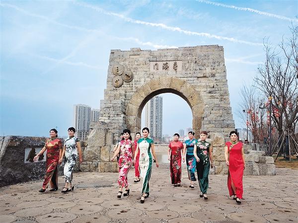 1月14日,身著各色旗袍的模特冒著嚴寒在南寨歷史文化街區(qū)普濟門前進行模特走秀表演,為冬日的城區(qū)增添了一抹亮麗色彩。