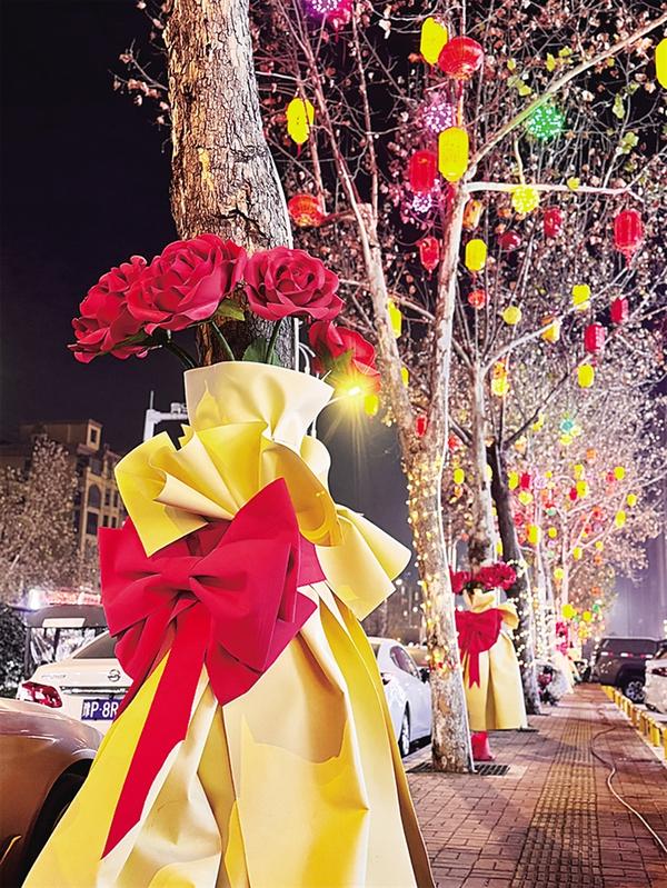 1月15日,記者在慶豐中路(勝利街至西六路段)看到,經過精心布置,行道樹搖身一變成為巨型“玫瑰花束”,仿佛是精心準備的城市禮物。