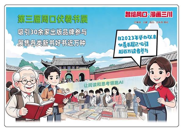 龍湖碧波映羲陵,時代書香沁古城。近日,第三屆周口伏羲書展從淮陽移師周口中心城區(qū),繼續(xù)開展專場展銷活動。本屆書展以“讓閱讀和思考領(lǐng)跑AI”為主題,聚焦“閱讀價值升維”,重點展售經(jīng)典人文、認知提升、深度思考類圖書。