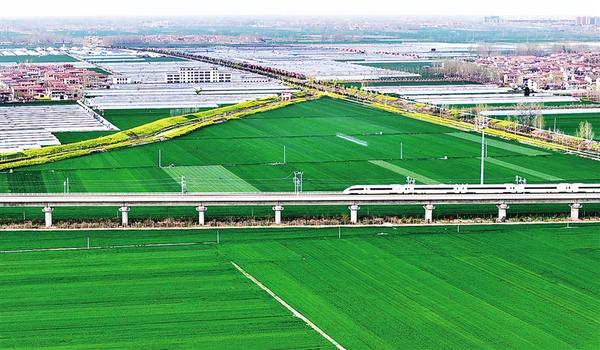 4月11日,一列高鐵列車駛過扶溝縣境內(nèi)廣袤的麥田。近年來,扶溝縣累計建成高標(biāo)準農(nóng)田119.7萬畝,疏浚治理河道64公里,維修重建閘涵33座,為實現(xiàn)穩(wěn)產(chǎn)增收提供了堅實保障。