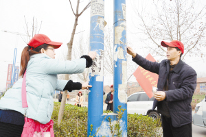 圖二為志愿者們正在清理路燈桿上的小廣告。
