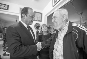 菲德爾·卡斯特羅會見奧朗德 5月11日,在古巴首都哈瓦那,古巴前領(lǐng)導(dǎo)人菲德爾·卡斯特羅(右)會見到訪的法國總統(tǒng)奧朗德(左)。當(dāng)日,法國總統(tǒng)奧朗德在古巴哈瓦那大學(xué)演講。他在演講中呼吁美國解除對古巴的經(jīng)濟封鎖。奧朗德于10日晚抵達(dá)哈瓦那,開始對古巴進(jìn)行為期3天的訪問,他是冷戰(zhàn)結(jié)束后首位訪問古巴的法國國家元首。
