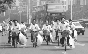 鄭州:騎著單車娶新娘      5月23日,新郎帶著新娘騎行在鄭東新區(qū)。 當(dāng)日,由鄭州晚報(bào)等單位主辦的“幸福相約”鄭州青年集體婚禮在鄭東新區(qū)舉行,共有16對(duì)新人參加?;槎Y上,新郎騎著自行車迎娶新娘,倡導(dǎo)低碳、簡(jiǎn)約婚禮。新華社記者 趙鵬 攝