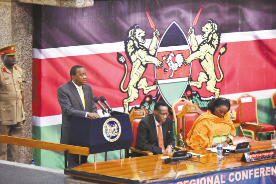 肯尼亞舉辦地區(qū)會(huì)議呼吁國際社會(huì)合作反恐 6月27日,在肯尼亞內(nèi)羅畢,肯尼亞總統(tǒng)肯雅塔(左)在地區(qū)會(huì)議上致閉幕辭??夏醽喺?5日至27日在首都內(nèi)羅畢舉辦地區(qū)會(huì)議,探討如何應(yīng)對暴力極端主義和恐怖活動(dòng),并呼吁國際社會(huì)合作反恐。(本欄文圖均據(jù)新華社發(fā))